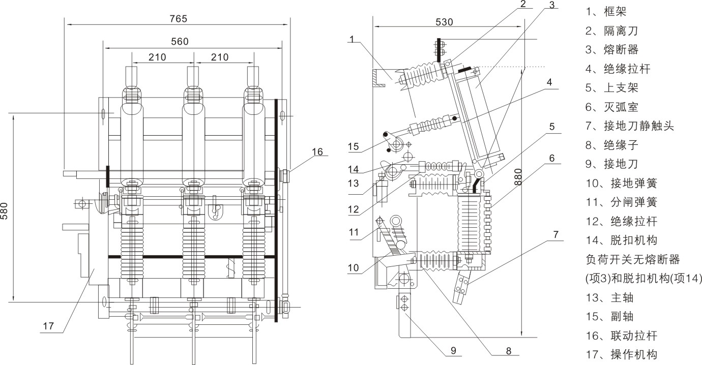 FZN21-12D/T630-20、FZN21-12DR/T125-31.5型高壓真空負(fù)荷開關(guān)及組合電器用于三相交流12KV、50Hz的配電系統(tǒng)中,具有結(jié)構(gòu)緊湊、體積小、重量輕、壽命長、關(guān)合開斷能力強(qiáng)、安全可靠等優(yōu)點(diǎn),與熔斷器配合使用(簡稱組合電器),可替代造價較高的斷路器,其操作和維護(hù)簡單方便。